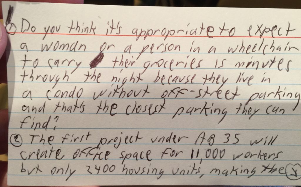 Numerous S.B. 50 opponents including myself attended the event and submitted tough, challenging questions on the note cards. Here were mine: